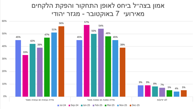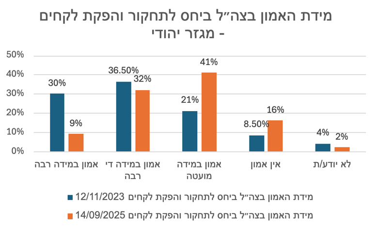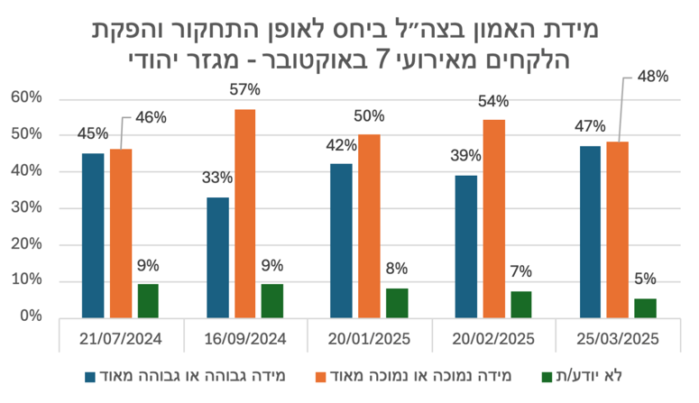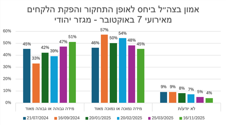 יתרה מכך, ספקנות הציבור ביחס לאופן התחקור והפקת הלקחים אף השפיעה על אמון הציבור בצה״ל ככלל ביחס לסוגיית התחקור והפקת הלקחים, ולא רק ביחס לאירועי 7 באוקטובר. בשאלה שנשאלה בסקרי בנובמבר 2023 ובספטמבר 2025, אפשר לראות ירידה ניכרת באמון הציבור בצה״ל ביחס לתחקור והפקת לקחים. נתונים אלה מצביעים על חשיבותו של העיתוי לביסוס אמון הציבור בתהליך התחקור. בעוד בתחילת המלחמה הביעו כשני שלישים מן הציבור אמון במידה רבה או די רבה ביחס לתחקור והפקת הלקחים על ידי צה״ל, ככל שהתקדמה המלחמה, התעכבו התחקירים ואלה שהתפרסמו לא ענו בהכרח על ציפיות הציבור - פחת שיעור המשיבים שהביע אמון גבוה ביחס לסוגיה, ובהתאמה חלה עלייה ניכרת בשיעור המשיבים שהביע אמון במידה מועטה.22