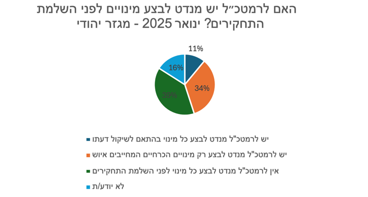 הסקר נערך בין 20–25 במרס 2025 בהובלת המרכז לאיסוף וניתוח נתונים במכון למחקרי ביטחון לאומי. עבודת השדה בוצעה על ידי"iPanel" במהלכה רואיינו באינטרנט 800 איש ואישה בקרב האוכלוסייה היהודית ו־153 בקרב האוכלוסייה הערבית, המהווים מדגם מייצג של האוכלוסייה הישראלית הבוגרת בישראל בגילאי 18 ומעלה. הנתונים משוקללים לפי מגזר. טעות הדגימה המרבית לכלל המדגם 3.2 אחוזים ± ברמת ביטחון של 95 אחוזים. לנתוני הסקר המלאים ראו: https://www.inss.org.il/he/publication/survey-march-2025