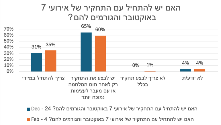 בימים הראשונים למלחמה שרר בקרב הציבור הישראלי קונצנזוס כמעט מוחלט כי יש צורך לתחקר את 7 באוקטובר. עם זאת, בתחילתה הפגין הציבור סבלנות ביחס למועד התחקור, בין היתר על רקע ההבנה כי המערכת כולה מושקעת בלחימה עצמה ובנטרול האיום הביטחוני. תפיסה זו משתקפת למשל בשאלה שנשאלה בסקר של המכון למחקרי ביטחון לאומי (INSS), מ־24 בדצמבר 2023, ובו סברו 65% מהנשאלים בקרב הציבור היהודי כי יש לערוך את התחקירים רק לאחר תום המלחמה, או עם המעבר לעצימות נמוכה יותר. כחודשיים לאחר מכן בתחילת פברואר 2024 היה עדיין רוב ניכר לטענה, אך כבר החלה לבוא לידי ביטוי ציפייה גוברת להתחלת התחקירים שגולמה בעלייה קטנה באחוז הסבורים כי יש להתחילם לאלתר.15