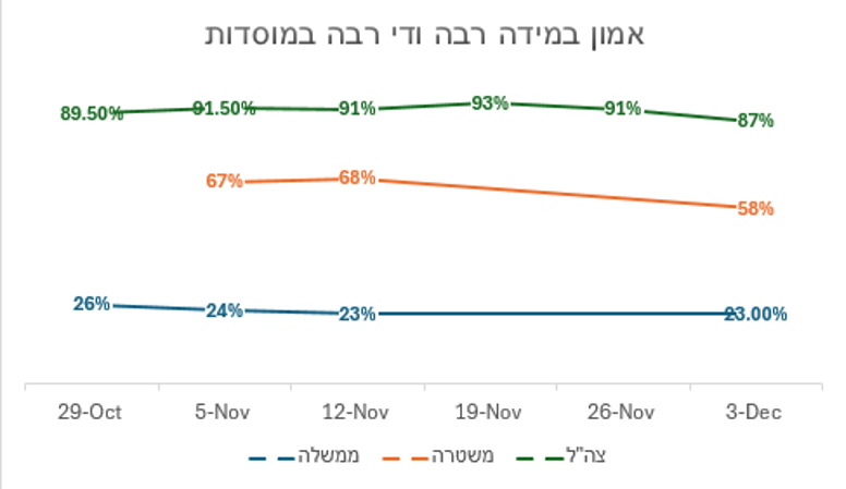 במדינה דמוקרטית, התפיסה השולטת היא כי זוהי אחריותו של הצבא לרכוש את אמון הציבור. צבא שאינו נהנה מאמון הציבור יתקשה לרתום את הציבור, להצדיק את ההשקעה בו ולעיתים אף את קיומו. לפיכך, רמת האמון של אזרחי מדינה בצבא היא אחת מסוגיות המפתח ביחסי צבא חברה. כפועל יוצא מכך, אירוע הגורם לאובדן אמון הוא אירוע דרמטי שעשויות להיות לו השלכות ניכרות על הצבא.5 על אף גודלו של הכשלון מצד צה"ל לספק הגנה בבוקר 7 באוקטובר, בסקרי דעת הקהל השונים הביע הציבור אמון גבוה בצה"ל החל מהימים הראשונים למלחמה. כפי שניתן לראות לעיל, בחודשיים הראשונים למלחמה, ועד להפסקת האש הראשונה, עמד שיעור המשיבים כי יש להם אמון במידה רבה או רבה מאוד בצה״ל על כ־90% אחוזים מהציבור היהודי בישראל. 6