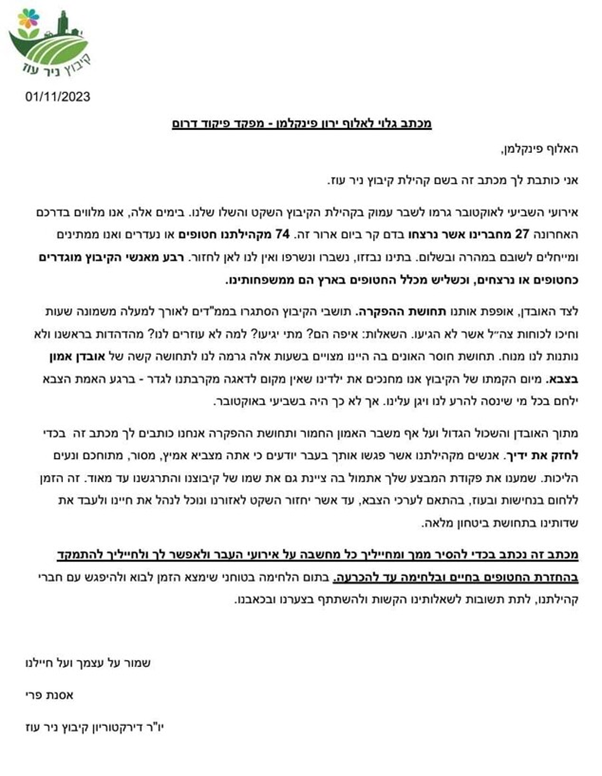 דוגמה מעניינת למארג זה ניתן לראות במכתב תושבי ניר עוז לאלוף ירון פינלקמן שנשלח אליו בימיה הראשונים של המלחמה. על רקע ביקורת נוקבת שנמתחה על מפקד פיקוד הדרום, אלוף ירון פינקלמן, שלחו תושבי הקיבוץ, שעד היום נחשב לסמל המחדל של 7 באוקטובר, מכתב למפקד הפיקוד. במכתב תיארו את משבר האמון ואת תחושת ההפקרה שליוותה אותם בכל אותו הבוקר. על אף כל אלה ביקשו לחזק את ידיו ואת רוחו, ושלחו לו מסר מפייס כשהם מזכירים: "זה הזמן ללחום בנחישות ובעוז". בסיום המכתב הבהירו שבתום הלחימה יהיה זמן "לתת תשובות לשאלות הקשות".