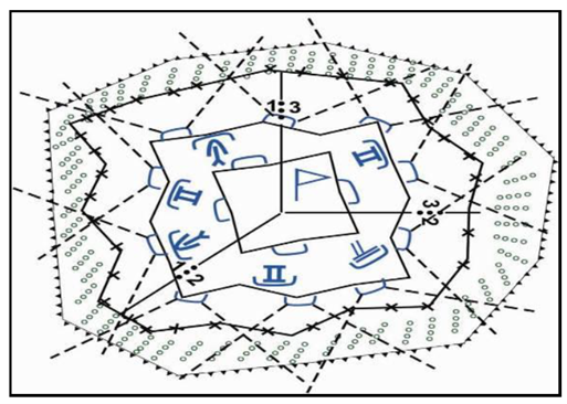 היתרון בהקמת גדר היישוב בצורת מצולע שבור הוא יצירת חודים חודרים לעומק מרחב ההגנה שהם בתוך הגדר, ויכולים לקיים ביניהם הדדיות בתצפית ובאש. בין חודי המצולע יתקיימו שטחי השמדה לאויב שינוע בין העמדות. כמו בדוגמה הבאה: