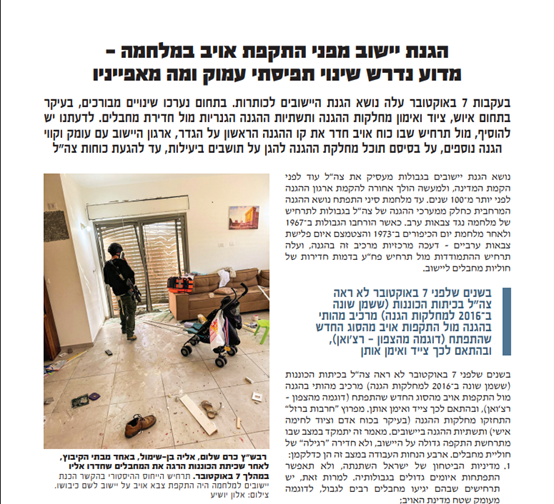 צודקים מחברי המאמר - אין מנוס מלייצר בכל דרך עומק בהגנה גם בהגנת היישובים. הפתרון שהציעו הוא, בלית ברירה, להילחם מגדר היישוב ואחורה ככל שנדרש כדי להשהות את האויב, לשחוק אותו ולהשמידו. הדבר יקרה גם תוך ויתור על שטח בתוך היישוב. נוסף על כך, סביר להניח שבמקרים מסוימים גם תוך כדי פינוי תושבים תחת אש ולחימה. סיטואציה דומה קרתה בכמה יישובים ב־7 באוקטובר דוגמת בארי, כפר עזה וחולית, שבהם לחימה ופינוי תושבים קרו בו בזמן. מדובר בשינוי תפיסתי משמעותי, שכן לפיו סביר שבעת התקפת אויב על יישוב נוותר ביודעין על חלק משטחו לשם שמירה על חיי התושבים. על פניו זהו פתרון של אין ברירה, אך אי אפשר להמשיך להחזיק קו הגנה אחד על הגדר ההיקפית, ולצפות שכך נמנע חדירת אויב ליישובים. ברם, אף על פי כן צריך למנות כמה בעיות במענה זה: